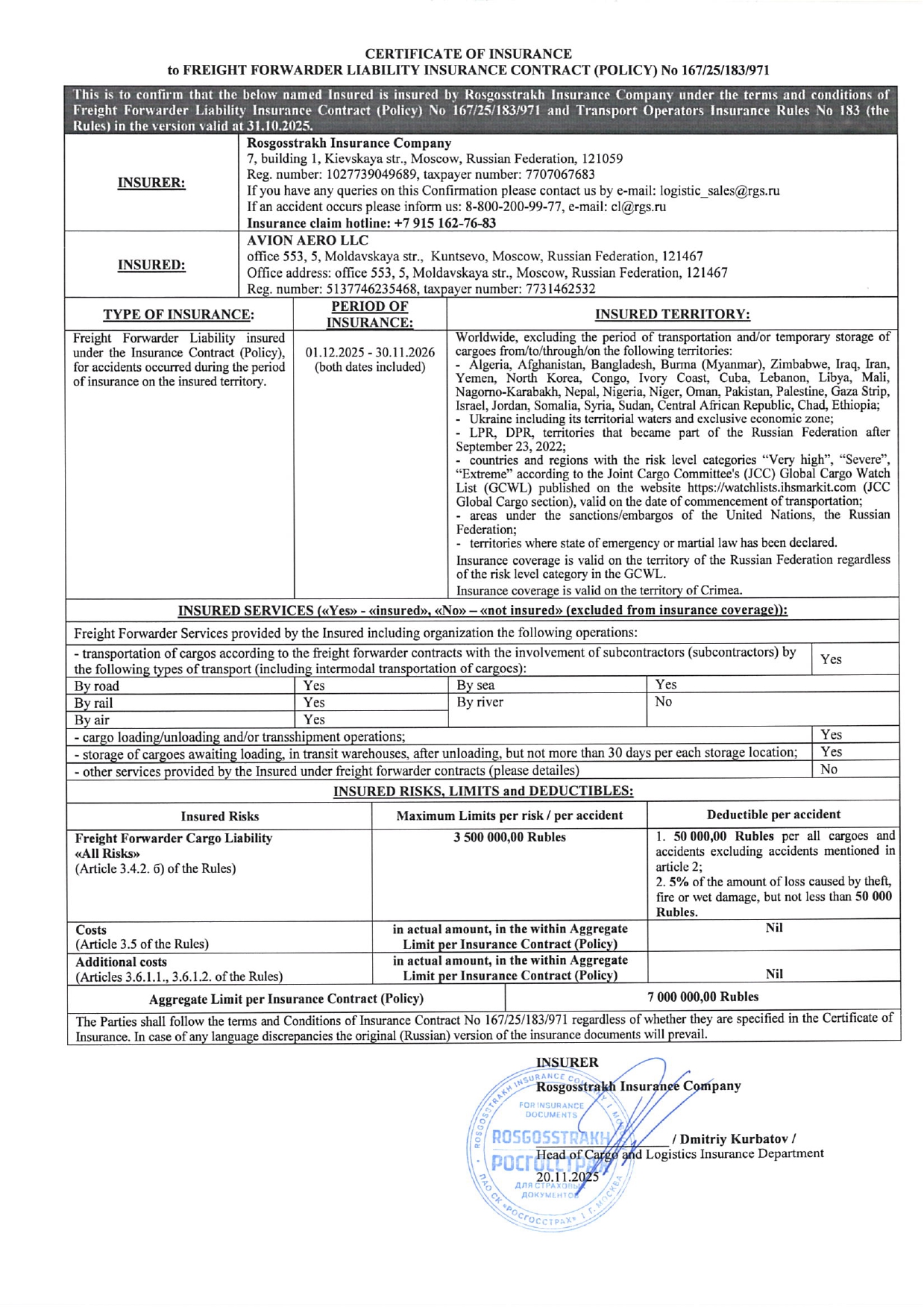 AVION AERO有限责任公司专家在运输危险、超大、重型及其他特别货物方面拥有多年经验。